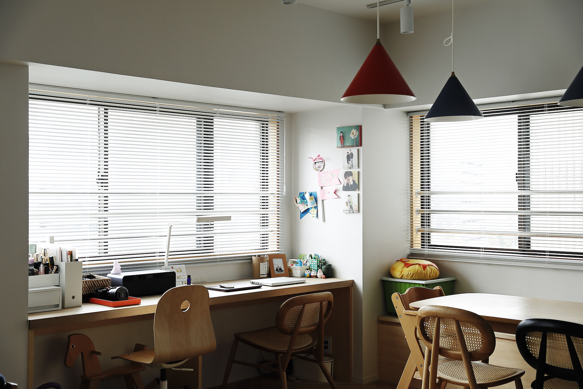 ご自宅にお伺いして、まず目を引いたのがダイニングの、三角シェードペンダント。カタチはシンプルながらも、カラフルな色が空間を彩りますね。またキッチンにもかわいい照明が並んでいました。不揃いなデザイン・配置がまたいいですね。
